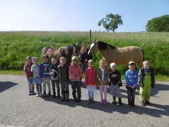 Heute ( 25. 5. 2023 ) sind wir zu Fuß zu dem Bauernhof von Heidi, Miriam und Marcel Wickert gegangen. Zuerst haben wir uns die Pferde angeguckt, den „Louis“ und seine Mutter „Maxi“. Wir Kinder haben uns schon sehr gut ausgekannt, aber auch noch was dazu gelernt. Z. B. dass Pferde auch Daumen haben. Streicheln durften wir auch, aber die Pferdezähne war nicht gut geputzt!