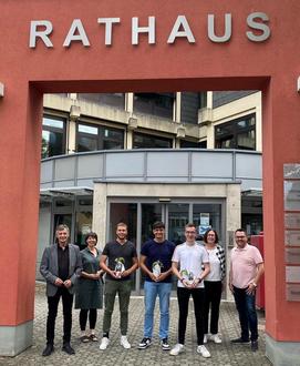 v.l.n.r.: Bürgermeister Michael Boos, Andrea Weber (Personalrätin), Erik Milz, Tim Weirich, Marvin Göhl, Ellen Becker (Büroleiterin), Matthias Gebhard (Personalsachbearbeiter)