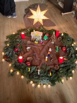 Vorausgegangen war ein religionspädagogisches Angebot, in dem mit allen Kindern ein Adventskranz in einer Mitte gelegt und gestaltet wurde. Es war eine ganzheitliche Anschauung "Der Adventskranz", mit hinführenden Gedanken auf das Weihnachtsfest.