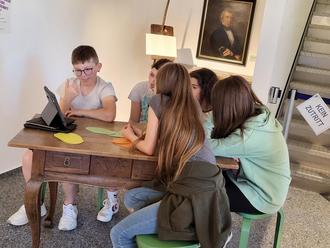Im Anschluss erkundete die Klasse in Kleingruppen mit iPads ausgestattet die QR-Codes der Ausstellung, um weitere wichtige Informationen über die Geschichte der Auswanderung vor 200 Jahren zu erfahren.