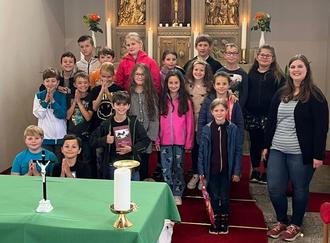 Die Kinder besichtigten das Kirchenschiff, die Empore und die Sakristei und probierten unter viel Gekicher ein paar Gewänder und Turbane von der Sternsingeraktion an. In der Sakristei bestaunten sie sodann den alten Messkelch und das Ziborium vom „Räzebore“ aus dem 18. Jahrhundert, die Monstranz, die freitags immer bei der Eucharistischen Anbetung zum Einsatz kommt, die Messgewänder in den unterschiedlichen liturgischen Farben und schließlich durften sie sogar einige Körnchen Weihrauch verbrennen und kurz die beiden Glocken, die Maria und Josef heißen, läuten. Küsterin Christina Hasselmann beantwortete viele interessierte Fragen und staunte dabei über die Begeisterung und das umfangreiche Wissen, aber auch über die großartige Disziplin der Kinder. So vergingen zwei Schulstunden wie im Flug. Zum Abschluss beteten alle noch zusammen das „Vater unser“, verabschiedeten sich andächtig mit einer Kniebeuge vor dem Tabernakel und kehrten wieder zurück zur Schule.