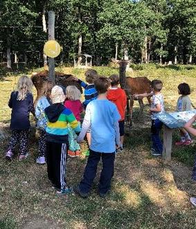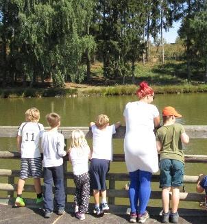 Vom Spielplatz aus machten wir in Kleingruppen Exkursionen. Hierbei sahen wir die Teiche in denen viele Enten und Gänse schwammen, sammelten Federn auf und meisterten einen anstrengenden Aufstieg, um die Lamas und Bisons anzuschauen.
