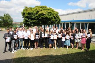 36 Schülerinnen und Schüler dieses Jahrgangs waren für die Abiturprüfungen angetreten, 33 haben die allgemeine Hochschulreife erworben. Und das Ergebnis kann sich sehen lassen! Die Durchschnittsnote aller Abiturientinnen und Abiturienten liegt bei 2,6. Besonders erfolgreich waren 5 Schülerinnen und Schüler. Diese sollen namentlich mit der erreichten Durchschnittsnote genannt werden. Das beste Ergebnis erzielte Danny Schleicher mit einem Durchschnitt von 1,4 gefolgt von Maxim Müller mit 1,5 und Felix Weber und Paula Schneider mit 1,6. Emelie Härter schaffte 1,8. Der Förderverein der Berufsbildenden Schule Simmern ließ es sich danach nicht nehmen, die fünf Besten des Jahrgangs mit einem Preis auszuzeichnen und herzlich zu gratulieren.