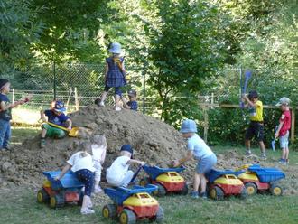 Seit einigen Tagen haben wir auf dem Außengelände eine richtige „Baustelle“. Auf dem Spielplatz liegt ein großer Dreckberg und unsere großen und kleinen Bauarbeiter haben viel Spaß, sie baggern, buddeln und graben. Sie fahren mit den LKWs den Dreck weg und ruhen sich aus. Vor dem großen Dreckberg steht ein großes Schild: „Vorsicht Baustelle!“