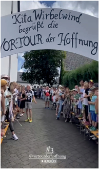 Am 21. Juli gastierte die VorTour der Hoffnung in Laubach. Viele Familien haben sich an dieser Aktion beteiligt. Gemeinsam haben die Kinder der Kita Wirbelwind die Ankunft der 120 Radfahrer gefeiert und ihnen eine selbstgebastelte Medaille übereicht.