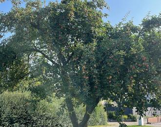Die gemeindeeigenen Obstbäume sind am Stamm mit einem gelben Zelluloseband markiert: Hier ist Pflücken erlaubt!