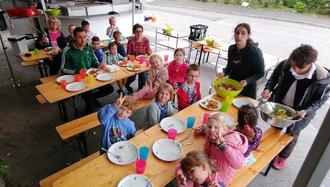 Das gemeinsame Mittagessen vor dem Kochbus bildete einen leckeren Abschluss und die Kinder hatten sichtlich Spaß!