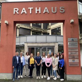 v.l.n.r.: Bürgermeister Michael Boos, Personalrätin Stefanie Vogt, Büroleiterin Ellen Becker, Personalsachbearbeiterin Veronika Frick-Becker, Johanna Rickers, Evelyn Higgs, Jule Mallmann, Jelina Herzel, Emma Naumann, Alisha Singer und Jasmin Prinz.