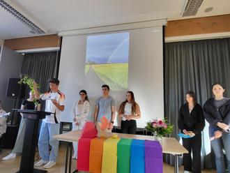 Im ersten Teil der Feier hatte das Gottesdienstvorbereitungsteam eine kleine Andacht vorbereitet, die in das Motto „Macht die Schule bunt durch Vielfalt!“ einführte. Der Regenbogen als Symbol dieser Vielfalt ist bunt, so wie auch das neue Schuljahr sehr bunt und farbenfroh werden soll.