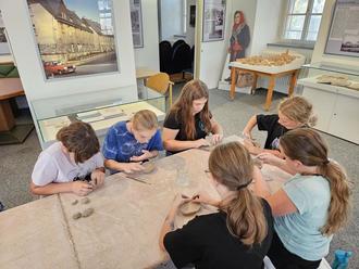 Thematisch befassten sich die Sechstklässler mit den Kelten. Anhand eines Zeitstrahls konnten einzelne Objekte zeitlich eingeordnet werden. Zudem durften die Kinder auch einmal von Hand ein wenig Mehr mahlen, wie es zur Zeit der Kelten üblich war. Ein kurzer Film bot der Klasse weitere Einblicke in das Leben der Kelten, bevor sich die Sechstklässler selbst künstlerisch betätigen konnten. Mit Ton durften sie kreativ arbeiten und stellten so beispielsweise kleine Gefäße und Schüsseln her, die sie im Anschluss mit bunten Symbolen bemalten.