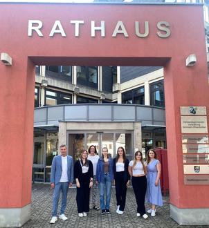 v.l.n.r.: Bürgermeister Michael Boos, Felice Krug, Büroleiterin Ellen Becker, Elena Stein, Alison Joy Herzel und Personalsachbearbeiterin Veronika Frick-Becker