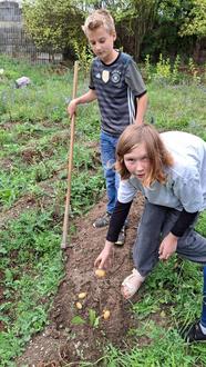 Mit Eifer machten sich Schüler der Klasse 6a und 6b an die Arbeit: Die Kartoffelernte im Schulgarten stand an. Sie staunten nicht schlecht über die reiche Ausbeute. Im Frühjahr hatten die Kinder die Kartoffeln selbst gesetzt. Das Unkraut musste regelmäßig entfernt werden. Die Kartoffelernte wird in den nächsten Wochen in der Schulküche verarbeitet. Die Klasse 6a wird sich an zwei Projekttagen vor den Herbstferien mit dem Thema „Rund um die Kartoffel“ beschäftigen. Die Klasse 6b hält für die Besucher am Tag der offenen Tür (22.11.2025) die ein oder andere Leckerei bereit.