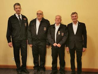 Bürgermeister Boos und Wehrleiter Andreas Roth bedankten sich bei Peter Konrad und Peter Marx für ihren langjährigen aktiven und pflichttreuen Einsatz zum Wohle der Allgemeinheit.