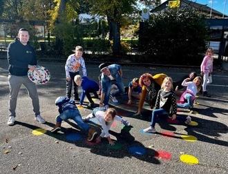 Fangen, verstecken, klettern, so erholen sich die Schüler*innen der Grundschule Rheinböllen am Liebsten in den Pausen und der Ganztagsschule auf dem Schulhof. In diesem Jahr hinzugekommen sind bunte Felder für Twister, Schach und Hüpfkästchen als weitere Spielmöglichkeiten. Dank des fleißigen Einsatzes der Ganztagesschulkinder wurden die ausgeblichenen Spielfelder unter Anleitung von Daniel Lenhard und seinem Team in bunten leuchtenden Farben wieder zum Strahlen gebracht. Der Förderkreis der Grundschule Am Hochsteinchen Rheinböllen e.V. hat die Mittel für die Farben und neue Schachfiguren zur Verfügung gestellt.
