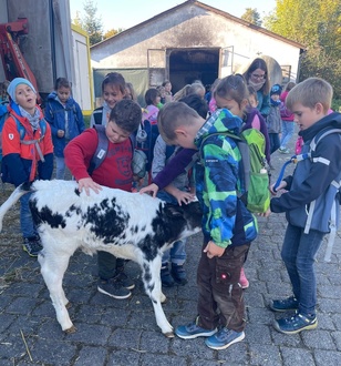 Die Freude war groß, als die Kinder ein Kälbchen besuchen durften, das in der vorherigen Nacht geboren wurde. Anschließend hatten sie die Möglichkeit, ein etwas älteres Jungtier zu streicheln. Vor dem Rückweg bekamen die Kinder Kakao und Streuselkuchen vom Blech. Es war ein erlebnisreicher, interessanter Vormittag und wir besuchen die Bergs gerne wieder!