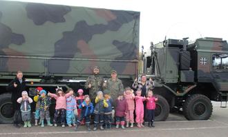 Herr Moor (ein Kita- Papa) und sein Kamerad Norman kamen mit dem großen Bundeswehr LKW vorgefahren.
