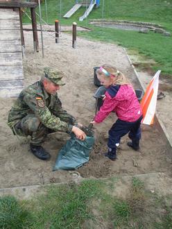 Danach erwartete uns ein Bundeswehr Übungs-Parcours: Sand schaufeln, Säcke schleppen, balancieren, Slalom laufen, kurbeln, kriechen, klettern und rutschen mit den Bundeswehr Utensilien.