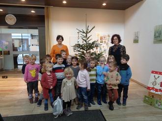 Der Kindergarten Sonnenschein in Mengerschied hatte eine Einladung von der Volksbank Rhein-Nahe-Hunsrück in Simmern erhalten, um mit selbstgebasteltem Schmuck den Weihnachtsbaum zu schmücken. Die freiwilligen Helfer machten sich schon früh auf den Weg, um mit dem Bus nach Simmern zu fahren. Dann marschierten wir vom Busbahnhof durch die Fußgängerzone zur Bank. Wir machten uns gleich an die Arbeit und schmückten den Baum.