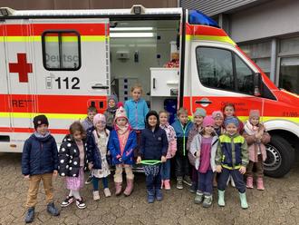 Die kleinen Gäste durften den Krankenwagen besichtigen und zwei Rettungssanitäter erklärten ihnen das Innenleben des Fahrzeuges.Besonders aufregend war es für die Kinder, das Blaulicht zu betätigen und die Erkundung der Schränke des Rettungswagens.