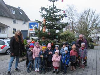 Kinder der Villa Kunterbunt Rheinböllen schmücken den Weihnachtsbaum der Volksbank Rheinböllen