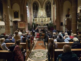 Für besonders andächtige Momente sorgten die Gastmusiker Zsolt Gabor und Orsolya Andorfi, die mit Gesang, Geige und Gitarre beeindruckten. Robert Reiter unterstützte sie am Bass. Gemeinsam mit der Band unter Leitung von Manuel Hortian (Piano) begleiteten sie die jungen Talente der Schule: Oleksandra Chernyshova (Gesang/Gitarre), Elias Hoffmann (Klavier), Luis Dillig (Schlagzeug) sowie die Solistinnen Sophie Feid und Dorcas Mwanga. Auch der Schülerchor mit Elias Errais, Ben Schmitt, Sarah Hoffmann, Lotta Jakobs und Dean Döhren trug zur feierlichen Stimmung bei.