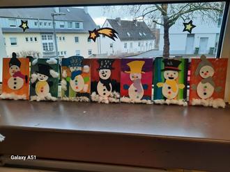 Auf Sperrholzplatten, die zunächst von den Kindern in ihrer Lieblingsfarbe lasiert wurden, klebten die Kinder Schneemänner aus unterschiedlich großen Wattepads. Natürlich wurden die Schneemänner mit verschiedenen Kopfbedeckungen, Schals und Handschuhen ausgestattet. Der Besen durfte nach Meinung einiger Kinder auch nicht fehlen. Eine lustige Schneemanngeschichte versetzte die Kinder zu Beginn in der Bastelaktion in eine winterliche Stimmung.