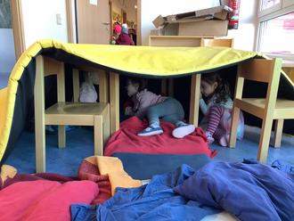 Im Januar schickten wir gemeinsam mit den Kindern das Spielzeug ‘‘in den Urlaub‘‘. Möbel, Decken, Kissen sowie einige Naturmaterialien durften bleiben. Wir spielten statt mit Dingen, viel mehr miteinander. Wir redeten, verabredeten, stritten, fanden Lösungen, besprachen und entwickelten Ideen weiter. Verwandelten unsere Funktionsräume in Tierheime, Kinos, Werkstätten und Konzerthallen. Dabei wurden Möbel gerückt, Kisten gestapelt, Vorhänge gezogen. Tische wurden zu Höhlen, Hochbetten und Ritterburgen. Das war eine tolle und erlebnisreiche Zeit für uns.