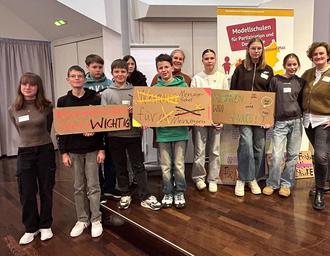 Anfang Februar trafen sich Vertreter*innen der Modellschulen für Partizipation und Demokratie aus ganz Rheinland-Pfalz zu einem Gesamtnetzwerktreffen in Mainz. Mit dabei waren auch die Schülervertretung der Puricelli-Schule mit insgesamt 9 Kindern in Begleitung ihrer Lehrerinnen Frau Ebert und Frau Wagner. Thema des Austausches waren die Auswirkungen der Digitalisierung auf die Zukunft der Demokratie. Alle Teilnehmenden hatten die Wahl, mittels interessanter Workshops Neues rund um Fake News, Hass im Netz, Demokratie und KI spielerisch zu lernen. Kreativ werden mit Design-Thinking und die Frage, welche Rolle Algorithmen in deinem Leben spielen - die Schüler*innen waren mit viel Freude und Engagement dabei.