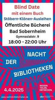 Am Freitag, den 4. April 2025, öffnet die Öffentliche Bücherei Bad Sobernheim ihre Türen zur bundesweiten „Langen Nacht der Bibliotheken“ und lädt alle Lesebegeisterten zu einem besonderen Abend ein. Unter dem Motto „Blind Date mit einem Buch“ erwartet die Besucherinnen und Besucher eine literarische Überraschung.