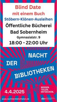 Am Freitag, den 4. April 2025, öffnet die Öffentliche Bücherei Bad Sobernheim ihre Türen zur bundesweiten „Langen Nacht der Bibliotheken“ und lädt alle Lesebegeisterten zu einem besonderen Abend ein. Unter dem Motto „Blind Date mit einem Buch“ erwartet die Besucherinnen und Besucher eine literarische Überraschung.