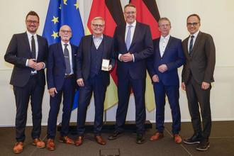 v.l.n.r.: Staatssekretär Dr. Erwin Manz, Roland Ruegenberg, Klaus Kaiser, Ministerpräsident Alexander Schweitzer, Uwe Engelmann, Staatssekretär Dr. Denis Alt