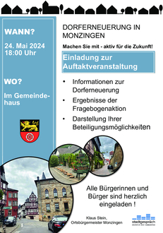 Am Freitag, dem 24. Mai 2024 fällt der Startschuss für die Dorfmoderation in Monzingen! Bei der Dorfmoderation soll durch Beteiligung und Mithilfe der Bürgerinnen und Bürger ein Zukunftskonzept für die Weiterentwicklung unserer Gemeinde erstellt werden! Gemeinsam mit den Einwohnern sollen die Stärken von Monzingen erarbeitet, Probleme besprochen und Lösungsansätze aufgezeigt werden. Es sollen möglichst alle sozialen Gruppierungen (Kinder, Jugendliche, Erwachsene, Senioren, Vereine, usw.) im Dorf angesprochen und zur Entwicklung von Ideen und Vorschlägen angeregt werden. Alle Bürgerinnen und Bürger sind daher aufgerufen, ihre Einschätzungen, Ideen und Wünsche für die Dorfentwicklung von Monzingen einzubringen!