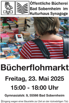 Die Öffentliche Bücherei Bad Sobernheim veranstaltet am Freitag, 23.Mai 2025, von 15:00 bis 18:00 Uhr wieder einen großen Bücherflohmarkt. Das Angebot umfasst sowohl gespendete als auch vom Bestand aussortierte Titel. Darunter finden sich Bilderbücher, Kinder- und Jugendbücher sowie Erwachsenenliteratur, außerdem Hörspiele, Hörbücher, DVDs und Zeitschriften. Während des Flohmarkts ist die Bücherei auch für Ausleihe und Rückgabe geöffnet. Der Spendenerlös des Bücherflohmarkts kommt direkt der Öffentlichen Bücherei Bad Sobernheim zugute. Das Büchereiteam freut sich auf zahlreiche Besucher!