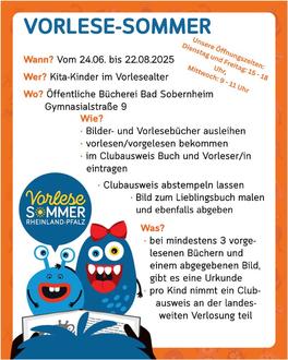Am 23. Juni 2025 startet landesweit der VORLESE-SOMMER Rheinland-Pfalz.Unter den zahlreichen Bibliotheken, die für diese Aktion den Kitakindern im Vorlesealter Lesestoff anbieten, ist auch die Öffentliche Bücherei Bad Sobernheim.