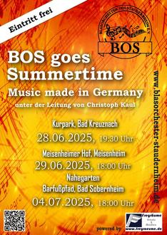 „BOS goes Summertime - Music made in Germany“ wird am 28. Juni um 19:30 Uhr im Kurpark in Bad Kreuznach, am 29. Juni um 18 Uhr im Meisenheimer Hof sowie am 4. Juli um 18 Uhr im Nahegarten am Barfußpfad in Bad Sobernheim aufgeführt. Wie immer finden die Konzerte bei freiem Eintritt statt. Nichtsdestotrotz freuen sich die Musikerinnen und Musiker im Anschluss an das Konzert über eine freiwillige Spende, damit es auch danach wieder heißen kann "BOS goes...". Dirigent Christoph Kaul und die Musikerinnen und Musiker des BOS freuen sich auf ihren Besuch.