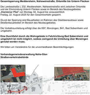 Die Landesstraße L 232, Meddersheim, Naheweinstraße wird zwischen Ortsmitte und der Einmündung Unterm Flecken sowie im Bereich des Neubaugebietes „Klarsteiner Pfad“ von Montag, 04. August bis voraussichtlich Freitag, 22. August 2025 für den Gesamtverkehr gesperrt.