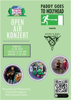 Am Samstag, den 24.08.2024 um 17:30 Uhr findet das mittlerweile fünfte große Sommerkonzert im Rheinland-Pfälzischen Freilichtmuseum statt. Seit inzwischen 35 Jahren ist die Irish Folk Band „Paddy goes to Holyhead“ auf Bühnen in ganz Deutschland unterwegs. Aufgrund des großen Erfolgs im letzten Jahr sind auch dieses Mal wieder die fliegenden Füße von Fiddle & Feet dabei. Paddy goes to Holyhead sind: Paddy Schmidt an Gitarre, Mundharmonika und Gesang, Almut Ritter an der Geige und Uwe Bender am Bass. Fiddle & Feet sind neben den beiden Stepptanzvirtuosinnen Natalie Westerdale und Lovis Hauck die Musiker Ed Westerdale an Geige und Gesang sowie Martin Bauer am Bass. Gemeinsam entführen zwei der aufregendsten Acts der deutschen Folk-Scene das Publikum auf eine musikalische Reise von Schottland, mit der „Titanic“ über den atlantischen Ozean zu modernem amerikanischen Jazz Tap und Cape Breton Stepdancing zurück zum irischen „Riverdance“.