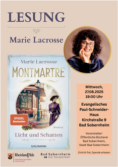 Am Mittwoch, 27. August 2025, liest die Autorin Marie Lacrosse (das Pseudonym für Marita Spang) um 19.00 Uhr im Gemeindesaal der Ev. Paul-Schneider-Gemeinde, Kirchstr. 9 in Bad Sobernheim aus Band 1 ihres Zweiteilers über den Pariser Stadtteil Montmartre in den letzten Jahrzehnten des 19. Jahrhunderts. Der Roman erzählt die bewegende Geschichte zweier junger Frauen, Elise und Valérie, die im Paris des späten 19. Jahrhunderts aus völlig unterschiedlichen Verhältnissen stammen, aber beide für ihre Träume als Tänzerin und Malerin kämpfen. Vor dem Hintergrund der Belle Époque schildert die Autorin eindrucksvoll das Spannungsfeld zwischen Arm und Reich sowie das Leben im aufstrebenden Künstlerviertel Montmartre. Die Autorin hat wie immer sorgfältig recherchiert und begleitet die Lesung mit Hintergrundinformationen zu Zeit und Handlung des Romans.