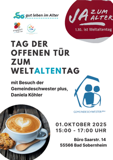 Das Büro des Vereins So gut leben im Alter e.V. öffnet zusätzlich seine Türen am Mittwoch, 01.10.2025, von 15 bis 17 Uhr. Die Gemeindeschwester plus des Landkreises Bad Kreuznach, Daniela Köhler, wird vor Ort sein. Wir laden herzlich dazu ein und freuen uns auf Ihren Besuch! Eine Anmeldung ist nicht erforderlich.