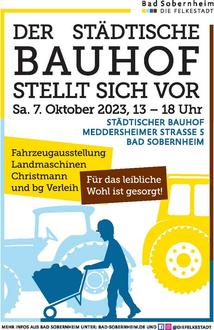 Unter dem Motto "Einblick in die Bauhof-Welt" laden wir alle ganz herzlich ein zum Tag der offenen Tür des städtischen Bauhofs am Samstag, den 7. Oktober 2023, von 13:00 bis 18:00 Uhr auf das Bauhofgelände in der Meddersheimer Straße.