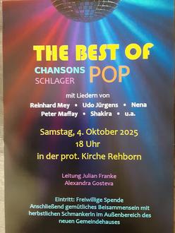 Der Gemischte Chor des MGV 1860 Rehborn veranstaltet am Samstag, dem 4.10.2025 um 18.00 Uhr, in der Kirche in Rehborn sein diesjähriges Konzert. Das musikalische Genre lautet "The Best of ", mit Chansons, Schlagern und weltlicher Chorliteratur. Alle Freunde des Chorgesangs sind herzlich eingeladen.