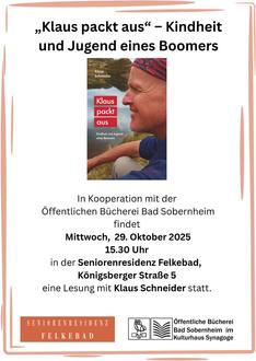 In Kooperation zwischen der Öffentlichen Bücherei Bad Sobernheim und der Seniorenresidenz Felkebad findet am Mittwoch, 29. Oktober 2025, um 15:30 Uhr in der Seniorenresidenz Felkebad, Königsberger Straße 5, eine Lesung mit Klaus Schneider statt.