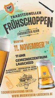 Am 11.11.2024 ab 11 Uhr lädt der Musik- und Unterhaltungsverein Lauschied e.V. herzlich zum Frühschoppen ins Gemeindezentrum ein! Freuen Sie sich auf einen geselligen Tag mit Blasmusik Non-Stop, köstlichen gefüllten Klößen und dem eigens gebrauten Lauschieder Musikanten-Bräu. Spiel, Spaß und beste Stimmung garantiert!