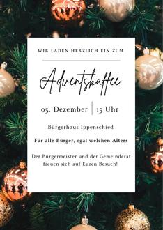 Der Ortsgemeinderat und der Bürgermeister möchten alle Ippenschieder Bürger herzlich zum Adventskaffee am Freitag, 05.12.2025 ab 15 Uhr ins Bürgerhaus einladen.