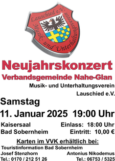 Der Musik- und Unterhaltungsverein Lauschied e.V. lädt zu Beginn des Jahres, am 11.01.2025, zum Neujahrskonzert der Verbandsgemeinde Nahe-Glan in den Kaisersaal Bad Sobernheim ein.