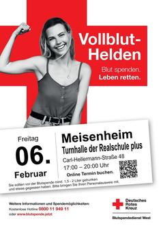Das Rote Kreuz ruft in Meisenheim am Freitag, 06.02.2026, von 17.00 bis 20.00 Uhr zur Blutspende in Turnhalle der Realschule Plus, Carl-Hellermann- Straße, auf.