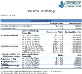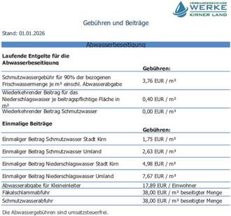 Der Verbandsgemeinderat hat in seiner Sitzung am 29.01.2026 die neuen Gebühren und Beiträge für die Wasserversorgung und Abwasserbeseitigung beschlossen. Die Verbandsgemeindewerke Kirner Land informieren nachfolgend über die ab dem 01.01.2026 geltenden Entgelte.