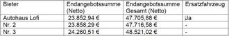 Nach der Auswertung der Angebote hat sich das Autohaus Lofi aus Idar-Oberstein mit einem Preis von 23.852,94 € /Netto (28.385,00 € /Brutto) als das günstigste Angebot herausgestellt. Zudem gewährleistet die Nähe zur Verbandsgemeinde eine effiziente Unterstützung bei Inspektionen und eventuell anfallenden Reparaturen.