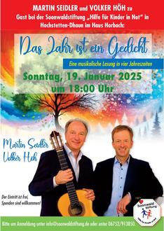 Genießen Sie diesen harmonischen und köstlichen Streifzug durchs Jahr am Sonntag, 19. Januar 2025 um 18.00 Uhr in Hochstetten-Dhaun im Haus Horbach. Martin Seidler und Volker Höh kommen für die Soonwaldstiftung „Hilfe für Kinder in Not“. Der Eintritt ist frei und es wird um Spenden gebeten! Bitte um Anmeldung per Mail unter info@soonwaldstiftung.de oder unter 06752 913850.