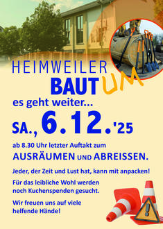 Der vorerst letzte Einsatz unter dem Motto: „HEIMWEILER BAUT UM”, sucht wieder tatkräftige Helferinnen und Helfer. Die vorerst letzten Arbeiten sind noch anzugehen, die wir in Eigenleistung als Gemeinschaft beitragen wollen. Auf, dass unser Gemeinschaftshaus wieder schön wird:))!